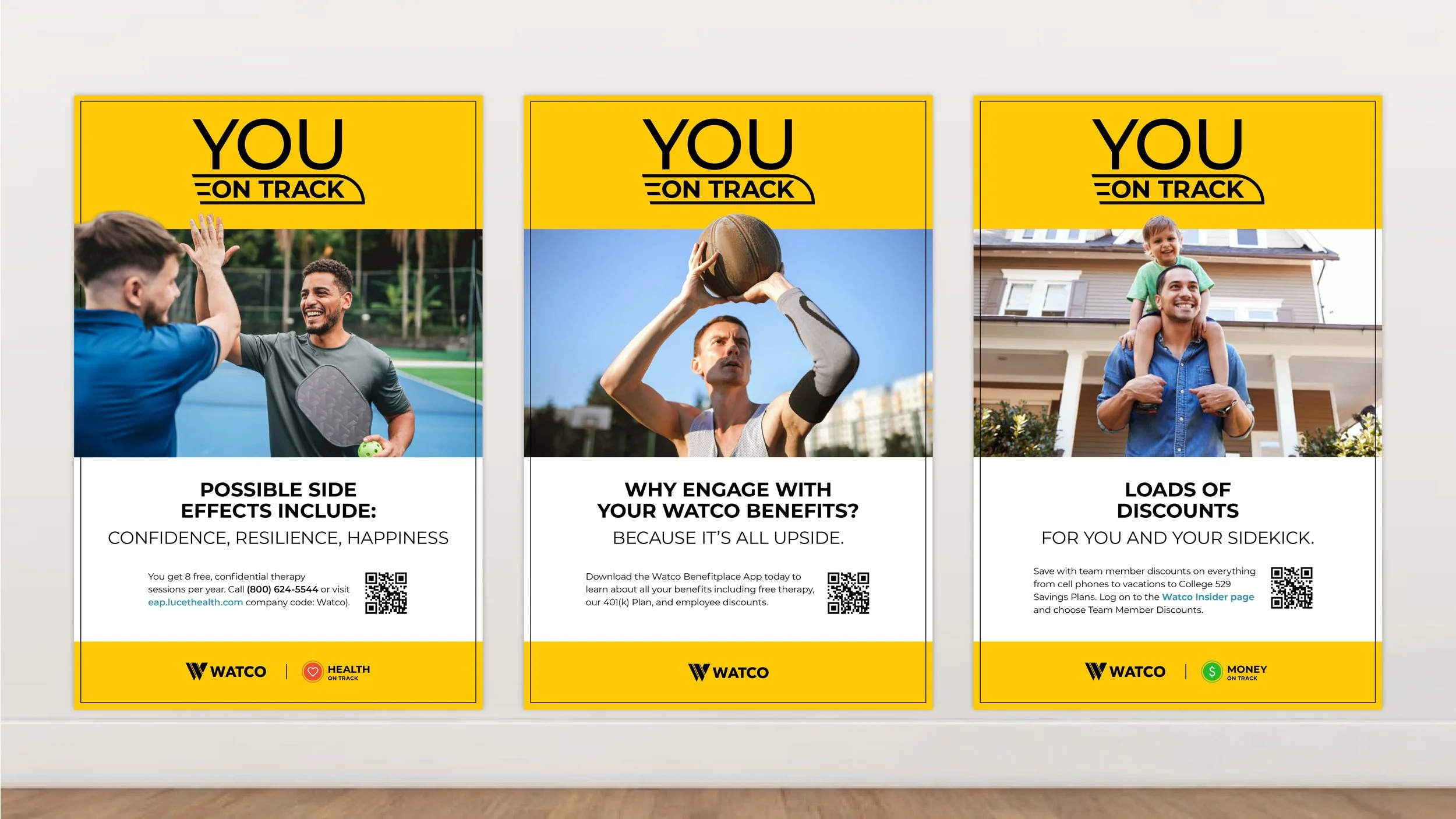 As a freelance designer for Blue Communications, I was tasked with conceptualizing a benefits brand for Watco. This selection showcases the deliverables included in the pitch deck.